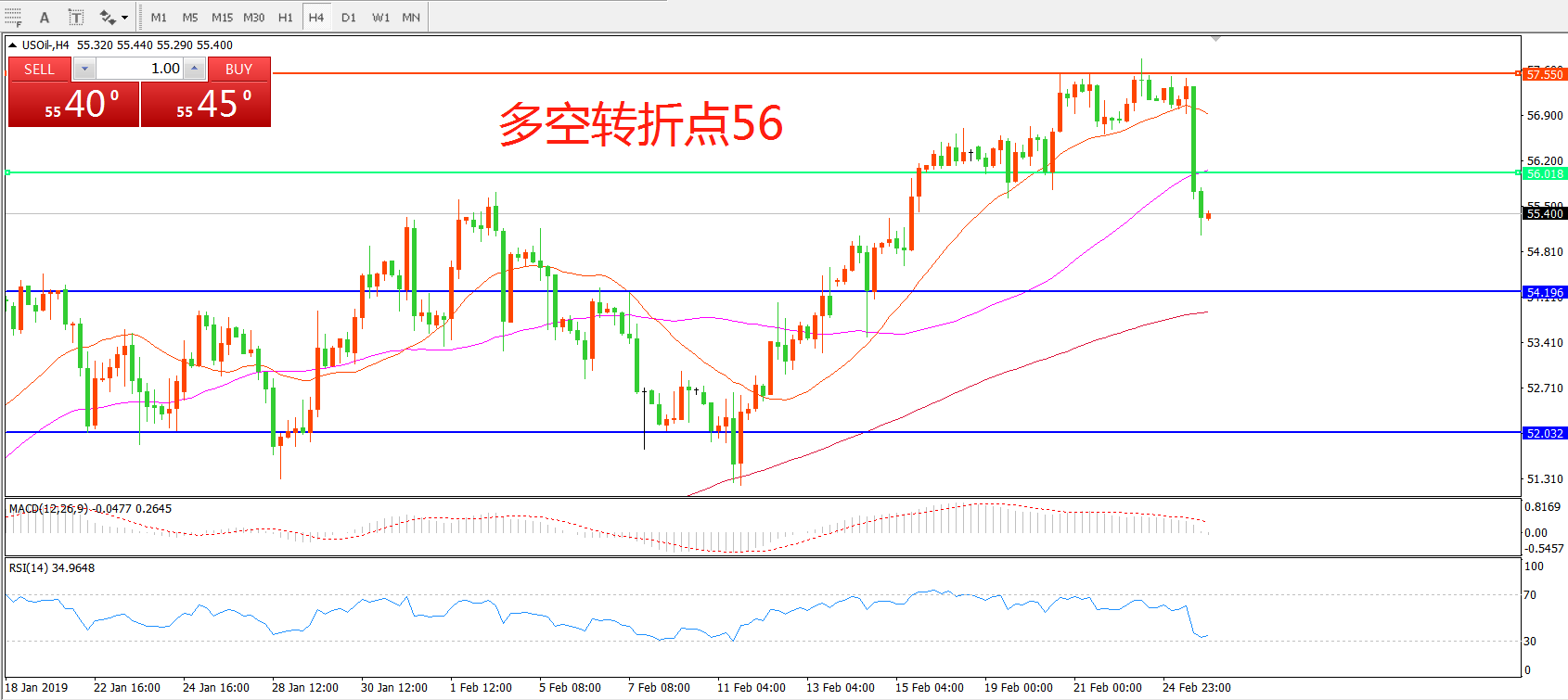 4小时图看,油价昨日长阴下破,击穿下方55均线支撑后继续下行。整体走势偏空,MACD红柱缩短,RSI指标掉头向下,日内延续下行走势概率较大。