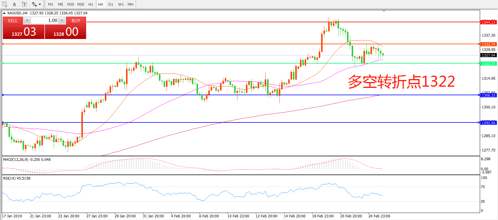 2月25日,第七轮中美经贸高级别磋商在美国首都华盛顿结束。美国总统特朗普表示,磋商取得实质性进展,美国将延后原定于3月1日对中国产品加征关税的措施。外部贸易谈判利好消息刺激下,避险情绪回落。 现货黄金周一小幅下跌,收报1329.50美元/盎司