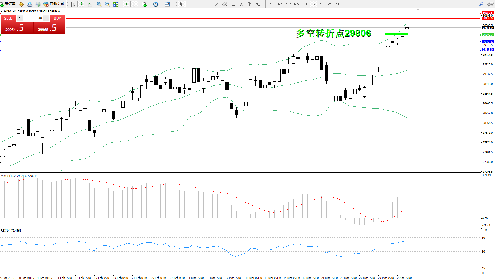 香港恒生指数早盘小幅高开后快速拉升,随后维持高位震荡,截至收盘,恒指涨1.22%,报29986.39点。财新中国3月服务业PMI由2月触及的四个月低点51.1升至54.4,创2018年2月以来新高,并轻松超过分析人士预期的52.3。据中国证监会期货监管部处长焦增军在香港所作报告,中国计划放松对股指期货的限制。计划包括恢复股指期货的正常交易,向外国投资者开放现有的股指期货。