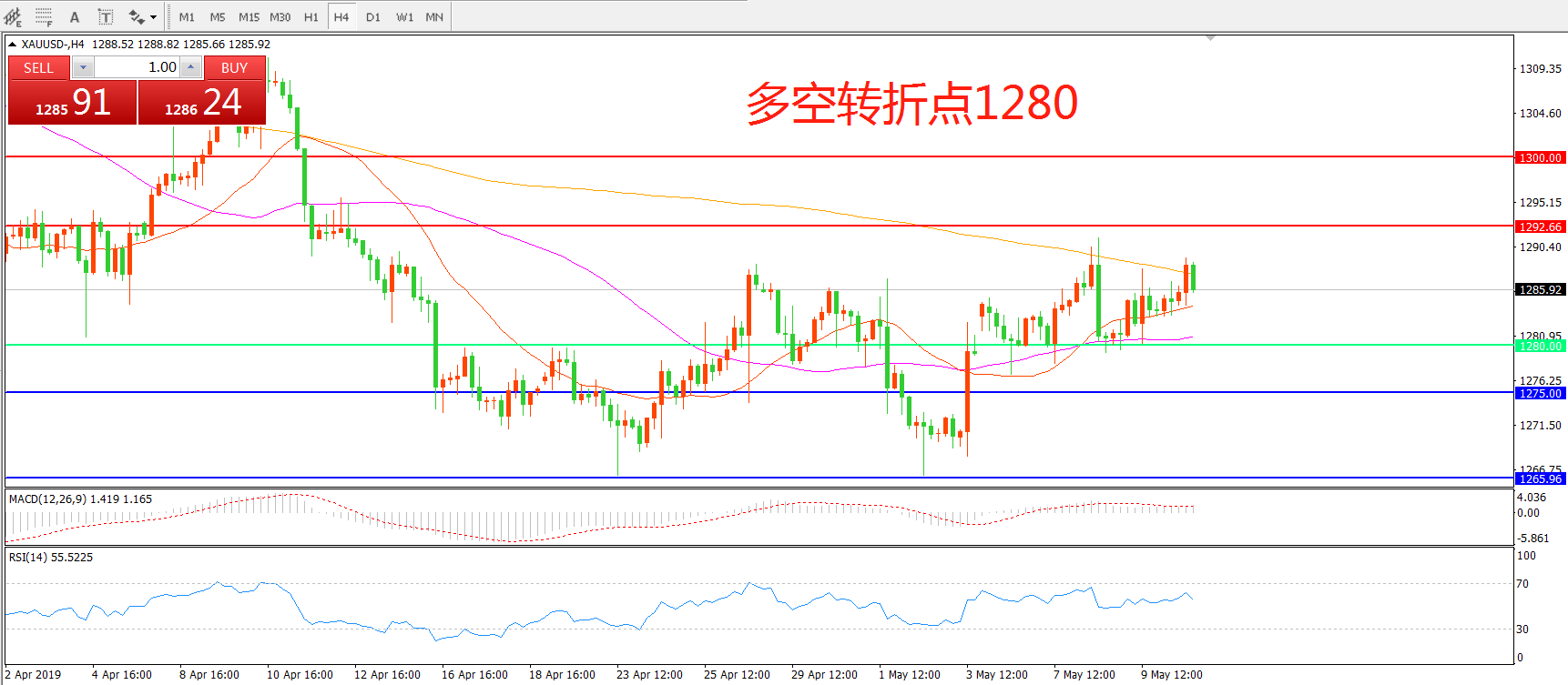 上周中美贸易局势风云突变,冲击全球——美国总统特朗普政府宣布上调对华关税税率、中国商务部称将不得不采取必要的反制措施;中美十一轮经贸磋商结束,没有达成协议,但由于市场对于黄金的看多情绪偏于谨慎,金价仍交投于1280-1292窄幅区间,技术面双底部依旧逐渐形成。