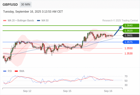 在 1.3575 之上,看涨,目标价位为 1.3620 ,然后为 1.3640 。