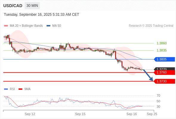 在 1.3805 之下,看跌,目标价位为 1.3760 ,然后为 1.3730 。