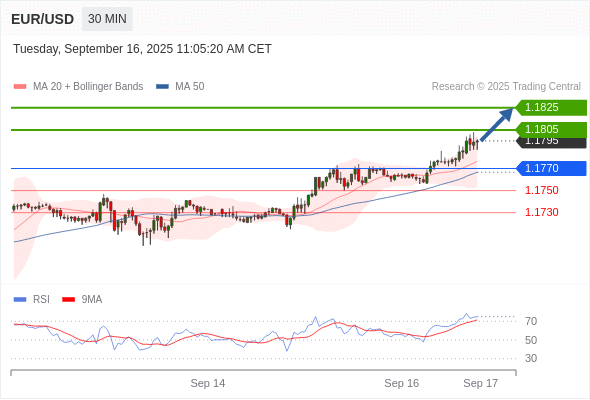 在 1.1770 之上,看涨,目标价位为 1.1805 ,然后为 1.1825 。