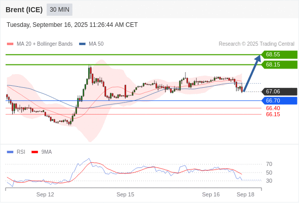 布伦特原油 (ICE) (X5) 当日内: 在66.70之上,看涨。