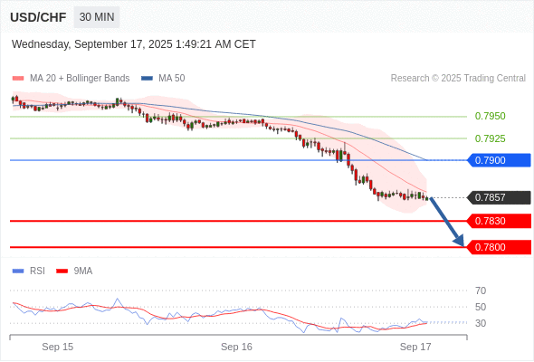在 0.7900 之下,看跌,目标价位为 0.7830 ,然后为 0.7800 。
