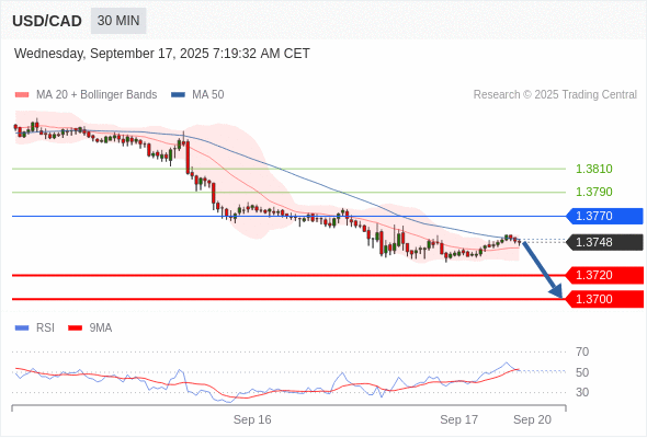 在 1.3770 之下,看跌,目标价位为 1.3720 ,然后为 1.3700 。