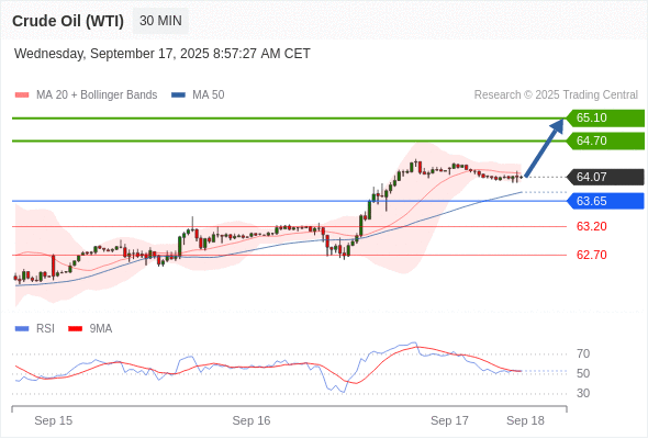 在 63.65 之上,看涨,目标价位为 64.70 ,然后为 65.10 。