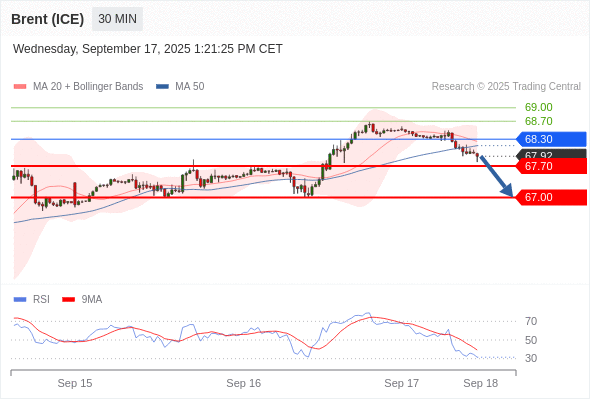 交易策略: 在 68.30 之下,看跌,目标价位为 67.70 ,然后为 67.00 。