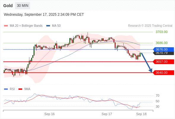 黄金现货 当日内: 短期关键阻力位在3676.00。