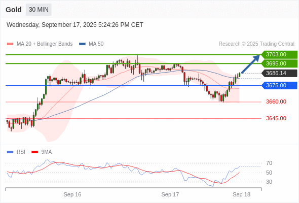 在 3675.00 之上,看涨,目标价位为 3695.00 ,然后为 3703.00 。