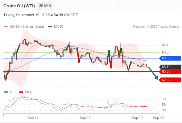 交易策略: 在 63.55 之下,看跌,目标价位为 63.00 ,然后为 62.65 。