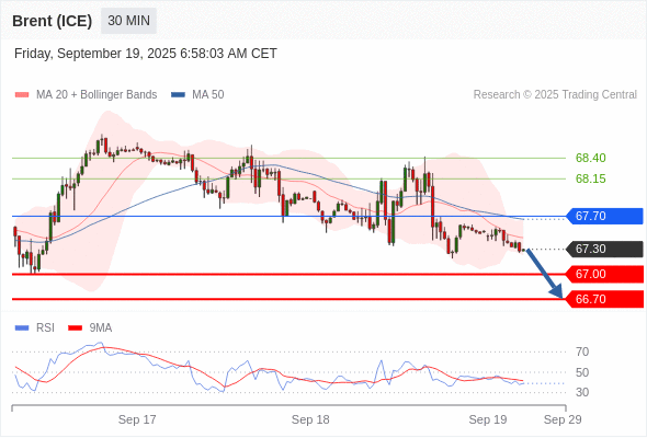 在 67.70 之下,看跌,目标价位为 67.00 ,然后为 66.70 。