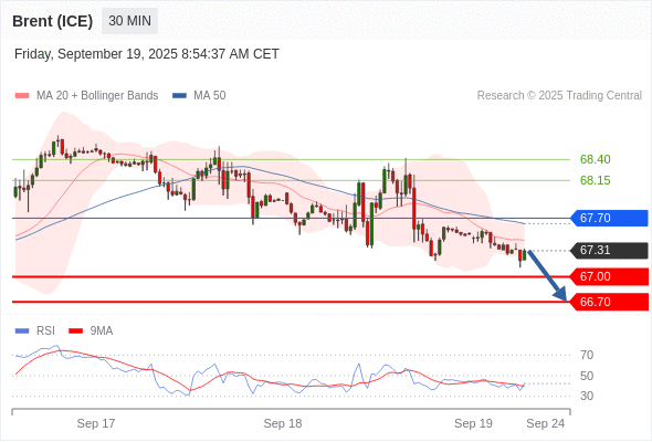 在 67.70 之下,看跌,目标价位为 67.00 ,然后为 66.70 。