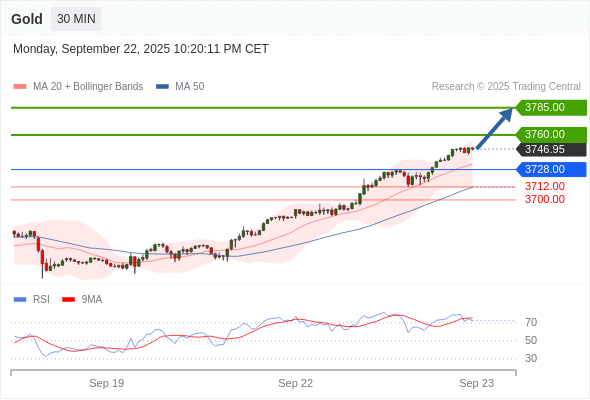 在 3728.00 之上,看涨,目标价位为 3760.00 ,然后为 3785.00 。