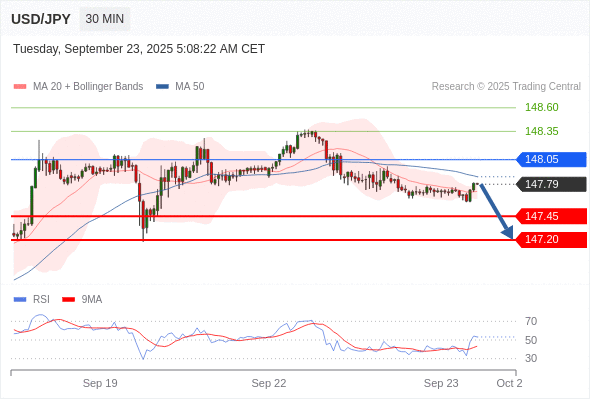 在 148.05 之下,看跌,目标价位为 147.45 ,然后为 147.20 。