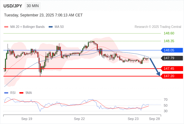 在 148.05 之下,看跌,目标价位为 147.45 ,然后为 147.20 。