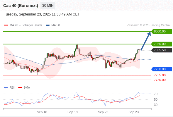 法国CAC指数期货 (Euronext) (V5) 当日内: 在7790.00之上,看涨。