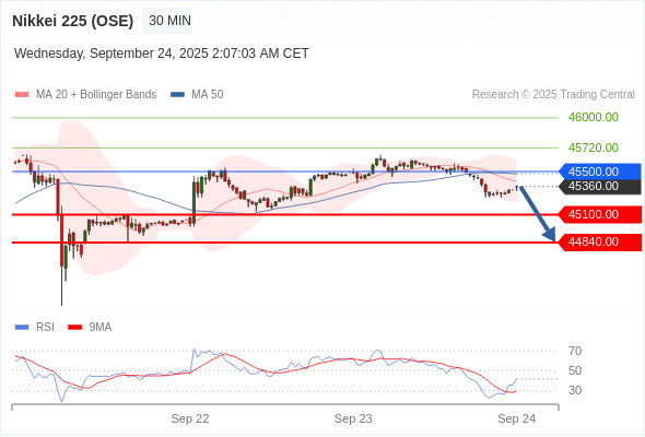 在 45500.00 之下,看跌,目标价位为 45100.00 ,然后为 44840.00 。