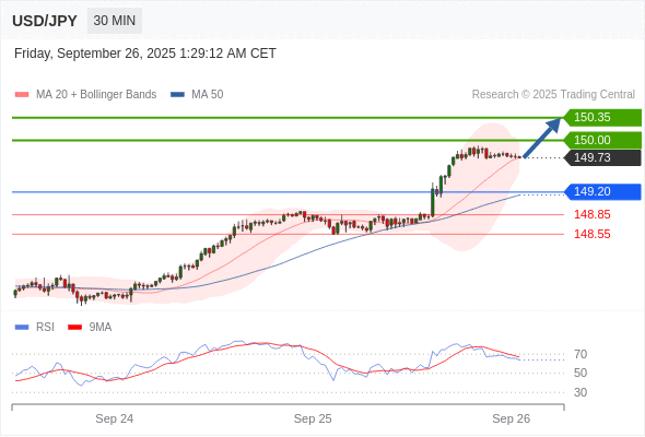 在 149.20 之上,看涨,目标价位为 150.00 ,然后为 150.35 。