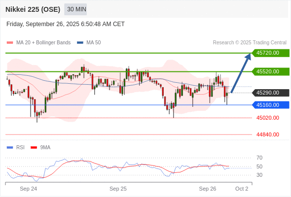 日经225股指期货 (OSE) 当日内: 在45160.00之上,看涨。