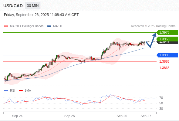 在 1.3905 之上,看涨,目标价位为 1.3955 ,然后为 1.3975 。