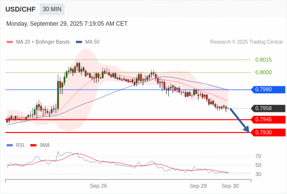 在 0.7980 之下,看跌,目标价位为 0.7945 ,然后为 0.7930 。