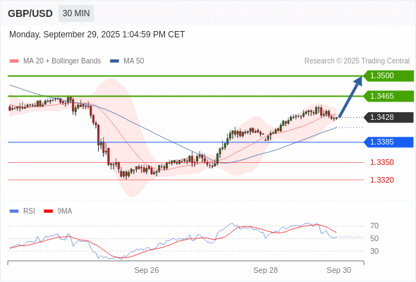 在 1.3385 之上,看涨,目标价位为 1.3465 ,然后为 1.3500 。