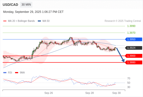 在 1.3950 之下,看跌,目标价位为 1.3900 ,然后为 1.3880 。