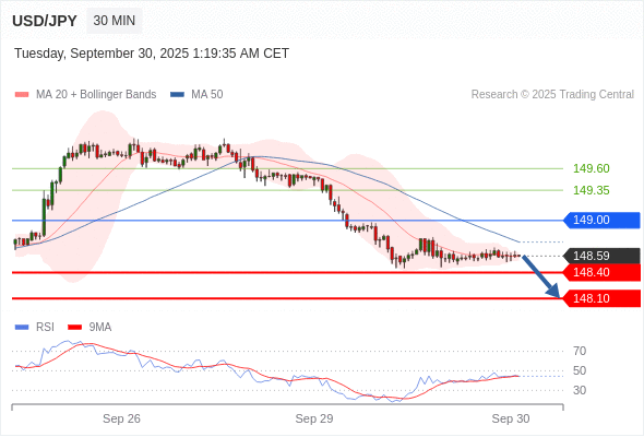 交易策略: 在 149.00 之下,看跌,目标价位为 148.40 ,然后为 148.10 。