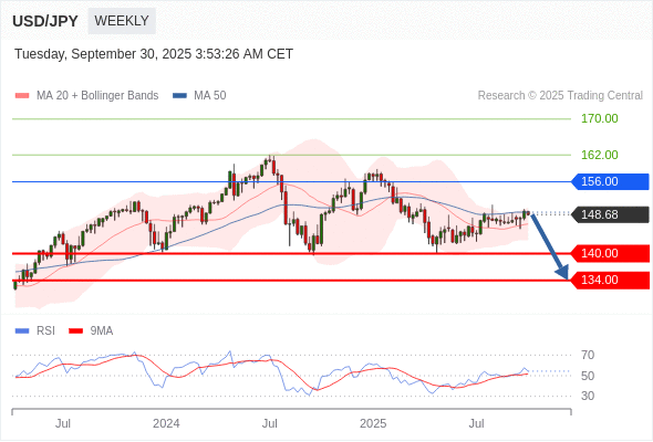 交易策略: 在 156.00 之下,看跌,目标价位为 140.00 ,然后为 134.00 。