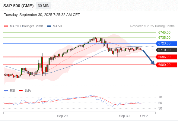 在 6723.00 之下,看跌,目标价位为 6696.00 ,然后为 6680.00 。