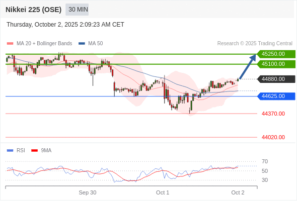 在 44625.00 之上,看涨,目标价位为 45100.00 ,然后为 45250.00 。
