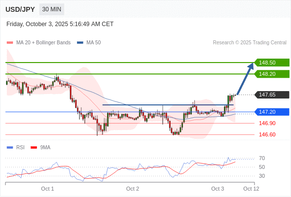 在 147.20 之上,看涨,目标价位为 148.20 ,然后为 148.50 。