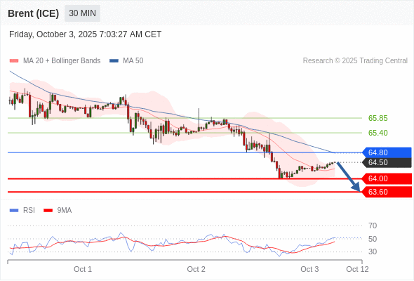 布伦特原油 (ICE) (Z5) 当日内: 短期关键阻力位在64.80。