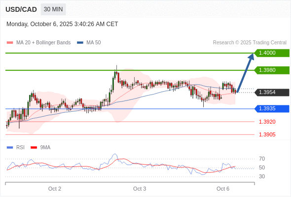 在 1.3935 之上,看涨,目标价位为 1.3980 ,然后为 1.4000 。