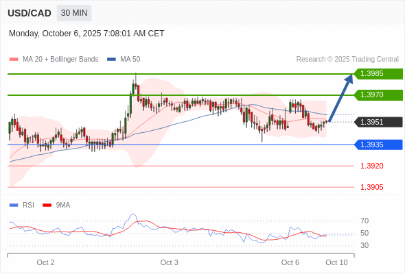 在 1.3935 之上,看涨,目标价位为 1.3970 ,然后为 1.3985 。