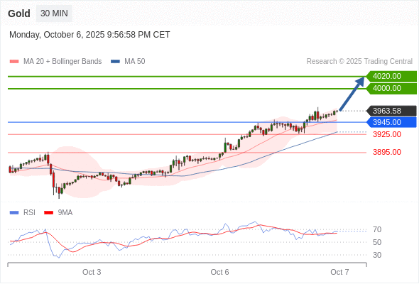 在 3945.00 之上,看涨,目标价位为 4000.00 ,然后为 4020.00 。