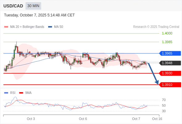 在 1.3965 之下,看跌,目标价位为 1.3930 ,然后为 1.3910 。