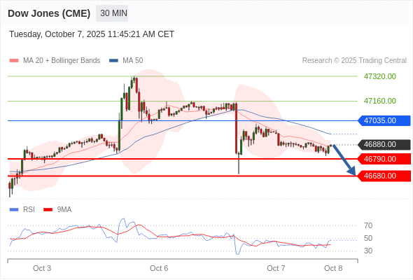 在 47035.00 之下,看跌,目标价位为 46790.00 ,然后为 46680.00 。
