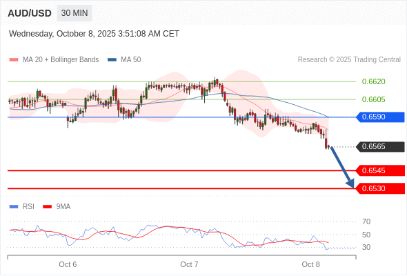 在 0.6590 之下,看跌,目标价位为 0.6545 ,然后为 0.6530 。