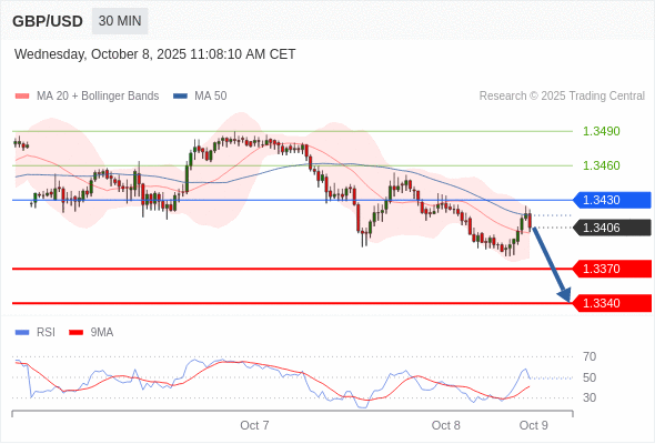 在 1.3430 之下,看跌,目标价位为 1.3370 ,然后为 1.3340 。