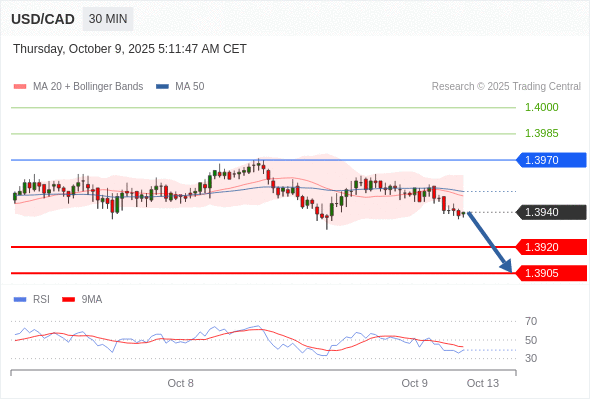 在 1.3970 之下,看跌,目标价位为 1.3920 ,然后为 1.3905 。