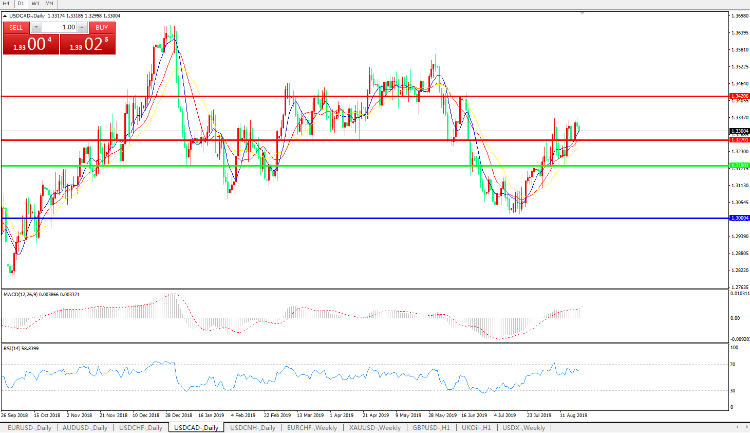 技术面简析:日线图均线整体呈发散上攻态势,汇价昨日高位窄幅整理,MACD运行于0轴上方且量能有放量迹象,RSI呈整理震荡态势,预计汇价短期将进一步上行,试探1.34附近压制。