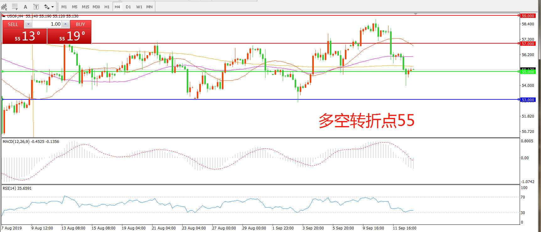 受到欧洲央行宽松举措以及中美贸易方面的消息的影响,金融市场短线剧烈波动, OPEC周四(9月12日)宣布同意要求伊拉克和尼日利亚达成减产来抑制原油供应,任何关于深度减产的正式决定都只能在12月的OPEC政策会议上做出,这令原油多头士气遭受抑制,美油震荡下行,最终收报55.14美元/桶。