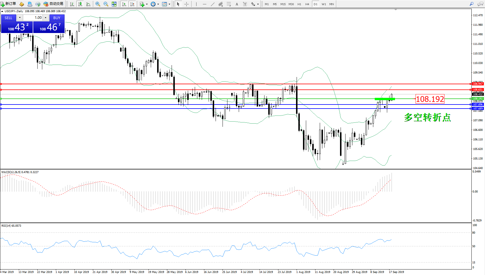 美联储最新点阵图显示2019年不会继续降息,这一情况正在对美元产生提振作用,因为市场在重新评估政策制定者接下来的鸽派程度。可以看到,预估中值维持了2020年利率不变,2021年与2022年将迎来上调,等于是美联储已经温和暗示宽松政策可能已经就此结束,美日上涨0.30%,接近盘中高点108.48,为8月1日以来最高,并保持在100日移动均线108.02的上方。