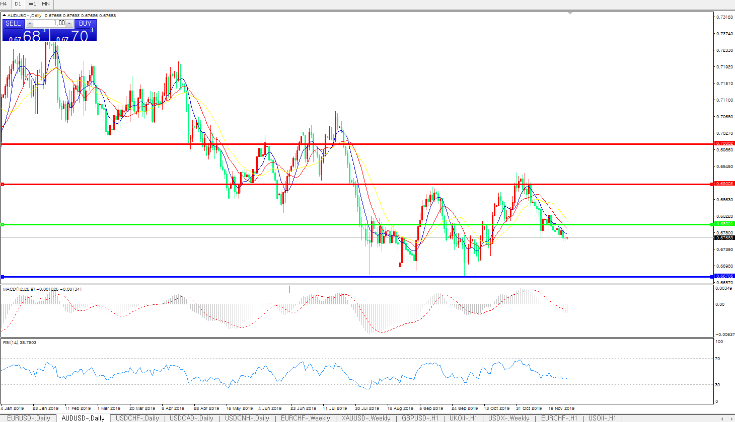 澳元兑美元在周四早盘受澳洲经济数据继续低迷影响跳跌至10月17日以来的新低0.6759,此后虽一度试图挣扎反弹,但无奈空头仍掌握行情主动权,这使得澳元过去四周以来的下行趋势变得更加难以扭转; 日内数据显示澳洲私营经济投资力度不振,这是继此前该国就业意外下行后再度传出的经济负面信号,虽然,投资者仍认为澳洲联储下周降息概率不大,但是其明年2月下一次会议强化宽松的预期却因此进一步上升,因此澳元汇价承压格局不变。而日内全球贸易环境前景再添变数之状况,也料令对此高度敏感的澳元汇价更受打击;眼下,澳元兑美元反弹空间已经受到10日均线(切入位在0.6794)的强力压制,而下方初步支撑在0.6740,跌破后即将下探10月16日的低点0.6724。考虑到近期美元指数持续坚挺,在美国感恩节假期结束之前,澳元下行压力仍将持续存在
