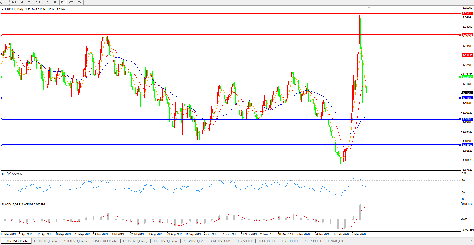 大华银行研究部周五(3月13日)讨论了欧元兑美元的技术前景,表示近期内采取中性倾向。我们在周三(3月11日,点位1.1300)曾提出,上行动能已经消散,并补充说“突破1.1230意味着2月份开始的涨势已经结束”。欧元兑美元昨日(3月12日)跌破了1.1230,直至1.1054,随后反弹,导致日内大幅波动了279点,幅度为2018年6月份以来最高。总体来看,周一的高位1.1496被视为短期内的顶部,自此开始,欧元兑可能在1.0980/1.1380范围内剧烈震动。