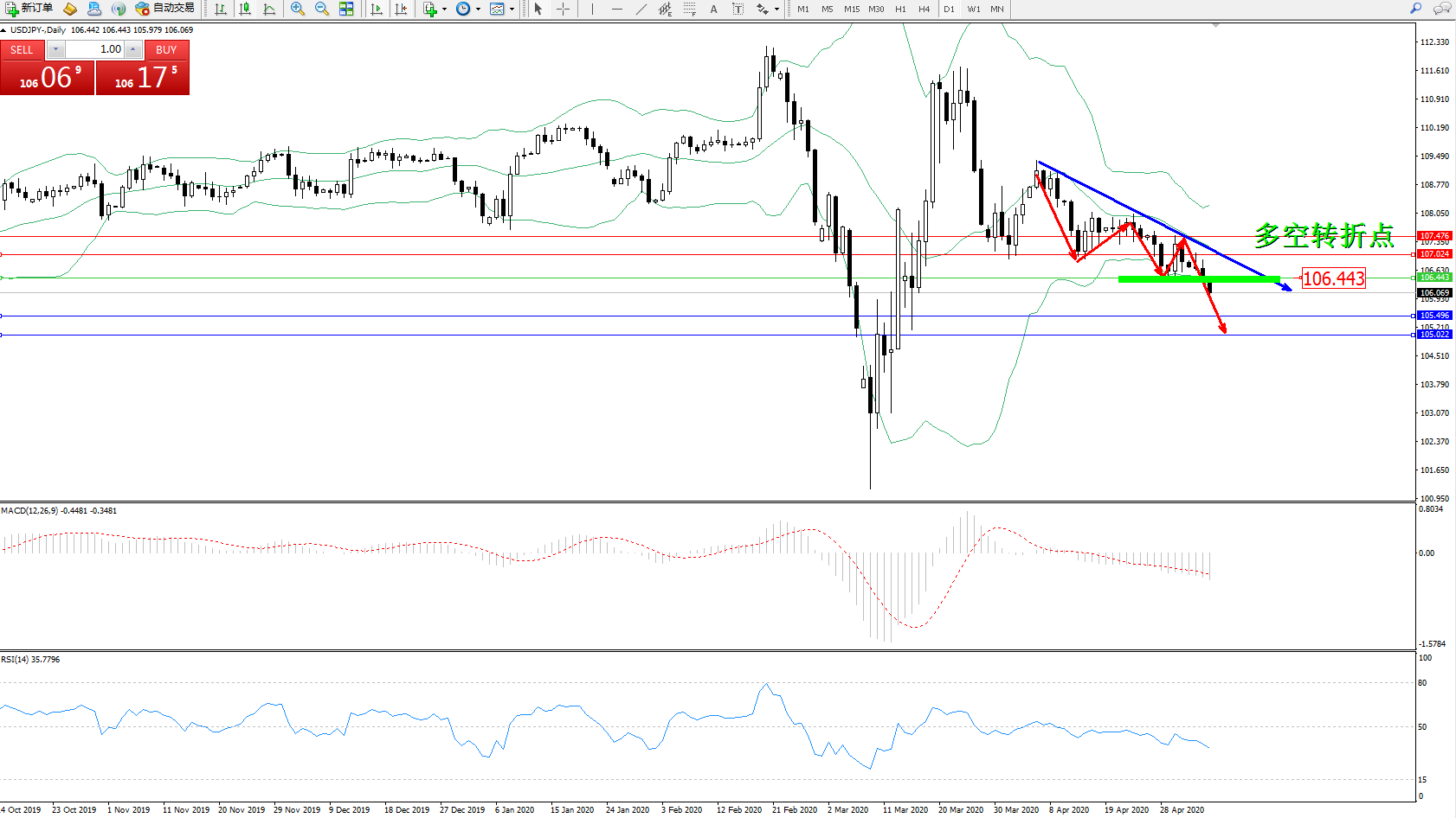 美元兑日元创七周新低至106.06,本周以来欧美经济数据持续披露出的疫情冲击影响状况,已经令市场避险情绪重新被点燃,在此状况下,高风险货币,尤其是欧系货币遭到持续抛售,而避险日元也因此再度成为汇市的领跑者;美元兑日元汇价因而也在日内跌破了106.45这一前期从101.19反弹至110.71这波行情的50%斐波那契回撤位,一旦日内收于该点位下方,则下行趋势将进一步巩固,后市或挑战106整数关口支撑。