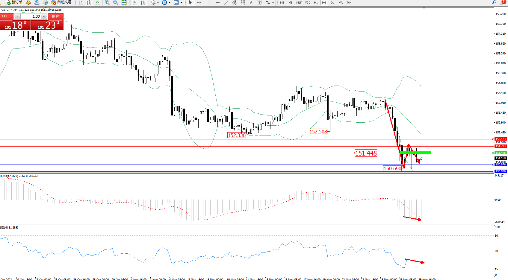 技术点评:空头动力延续布林带指标多头下轨附近持续震荡下行,低位抵达150.690位置后得到短暂支撑开始整理平移,短期多头开始伺机入场,但整体依旧处于弱势下行态势,布林带指标呈张口走势后开始有缓慢收口迹象,MACD指标处于空头区域维持整理,RSI指标处于空头区域维持低位弱势徘徊;