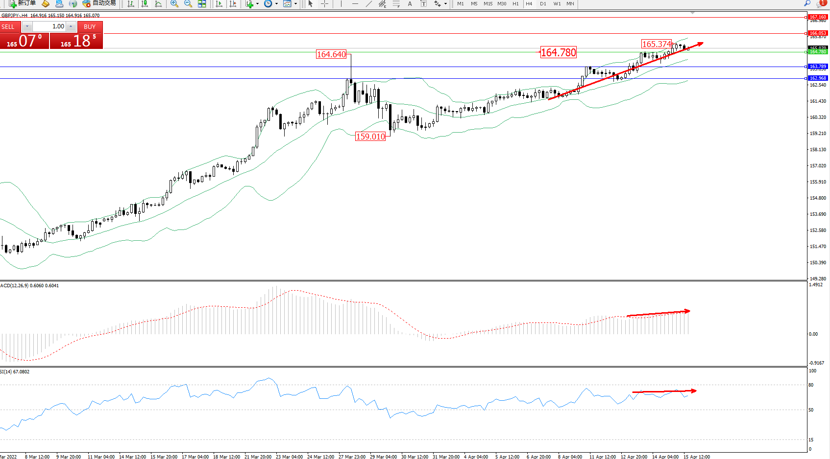 技术点评:多头动力延续布林带指标通道中上轨区间持续震荡上扬,高位抵达165.374附近节点后开始整理,短期多头动力有继续攀升态势,前期高位164.640位置已然破位,且多头动力未见有止步迹象,布林带指标呈上行趋势走势态势良好,MACD指标处于多头区域维持整理平缓上移,RSI指标处于多头区域维持窄幅整理中;